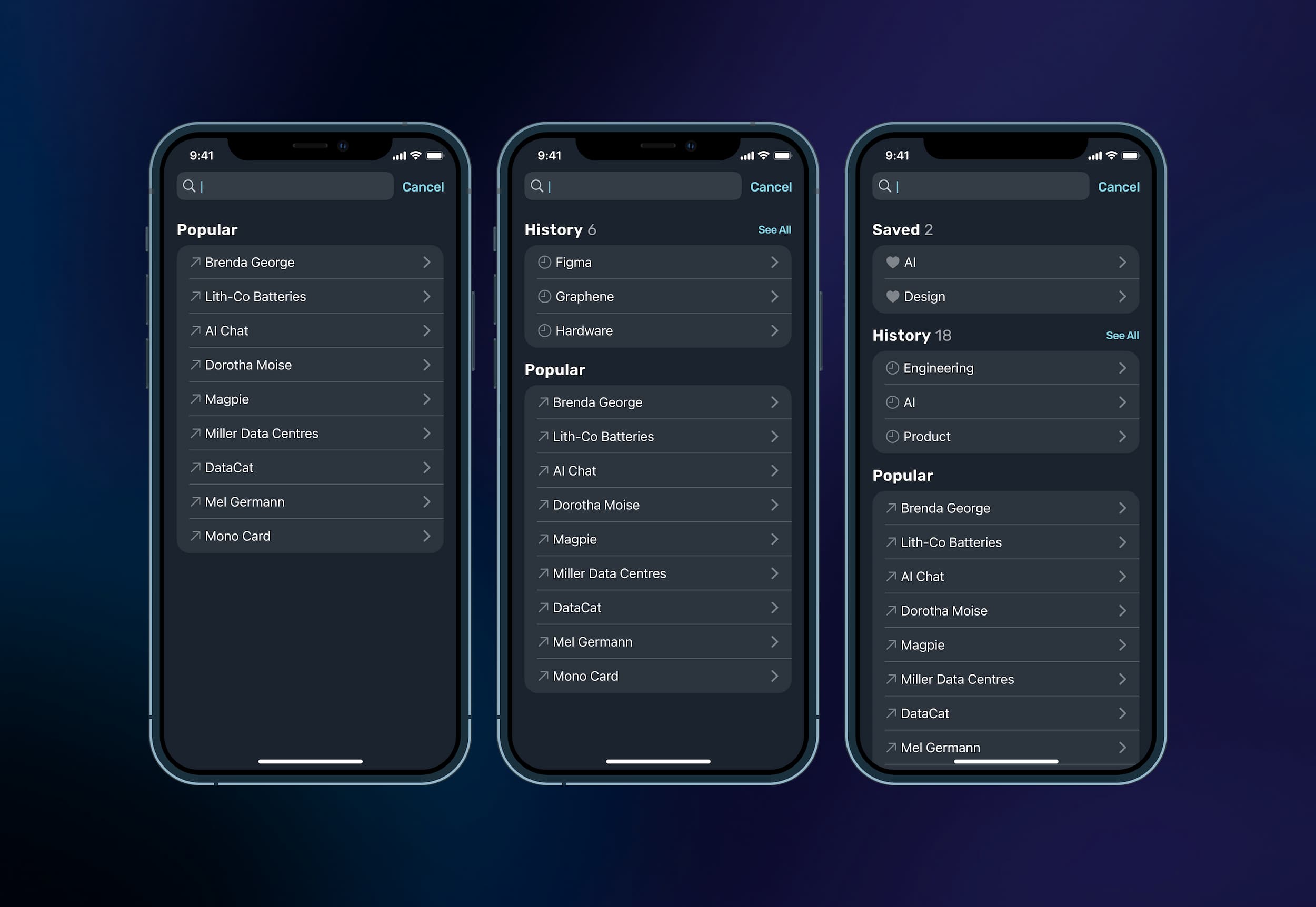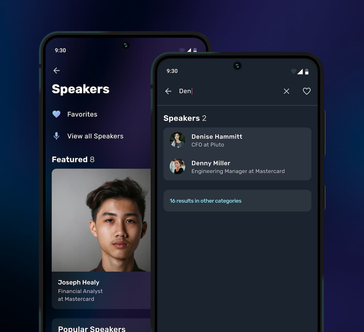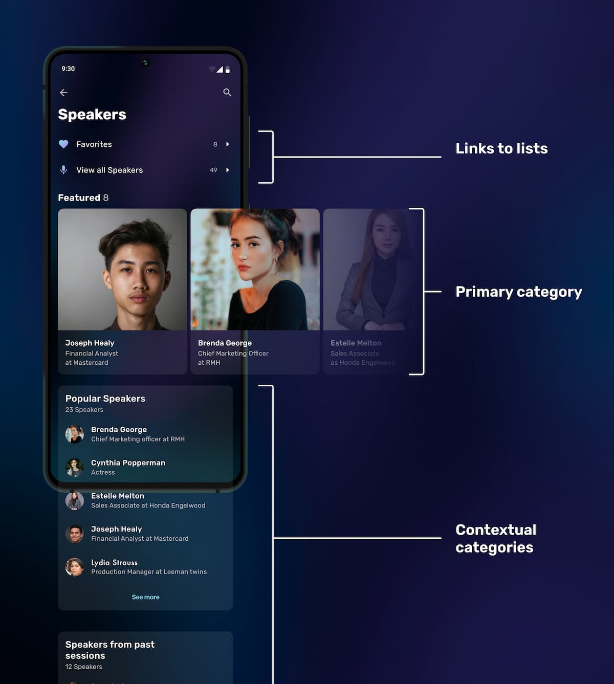 As some entity lists could contain upwards of 20,000 items, discovery is an overwhelming task of endless scrolling. Using the same context-driven approach for sessions, we created categories within each entity group to provide attendees with more discovery options than scrolling alphabetical lists.