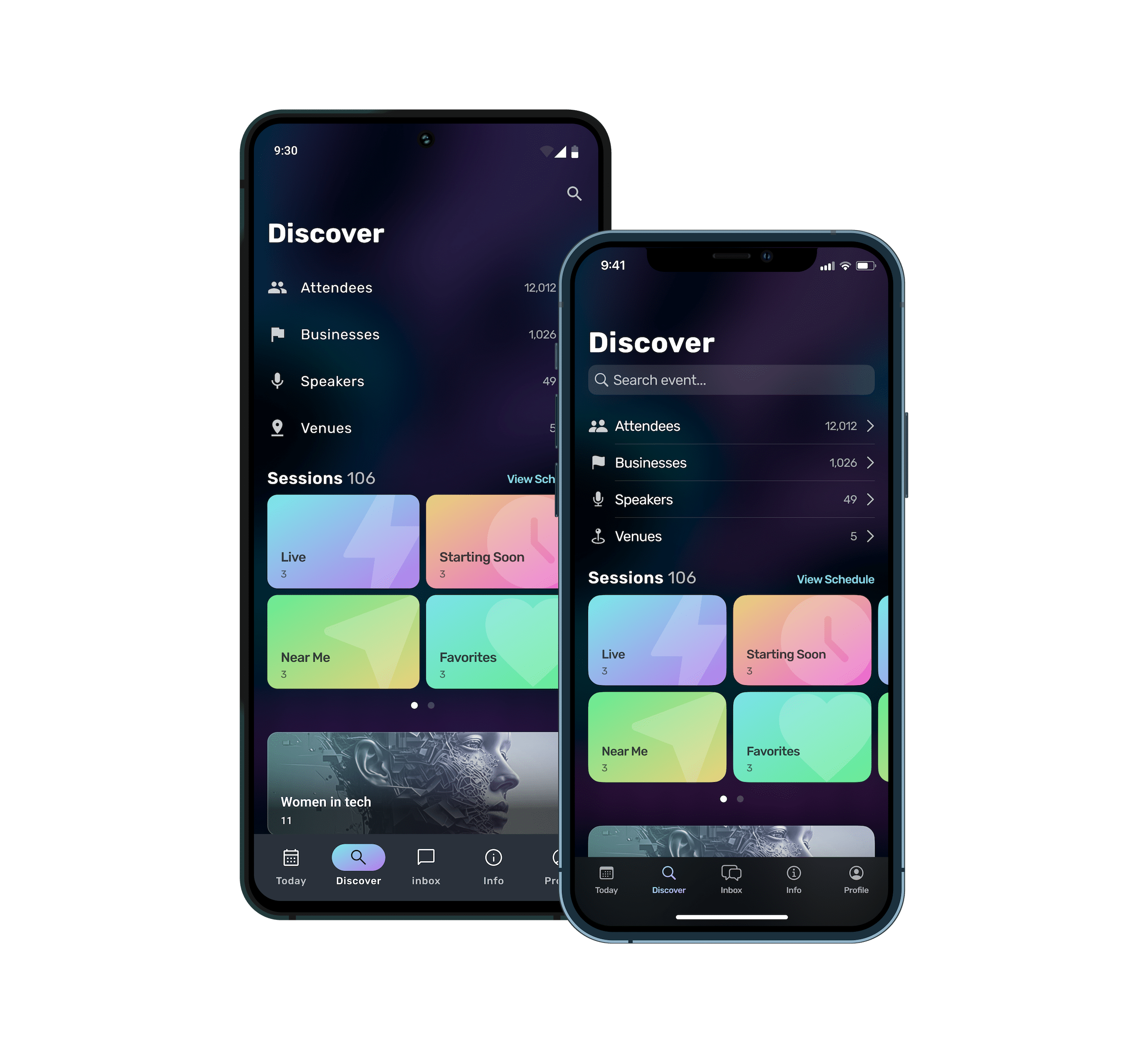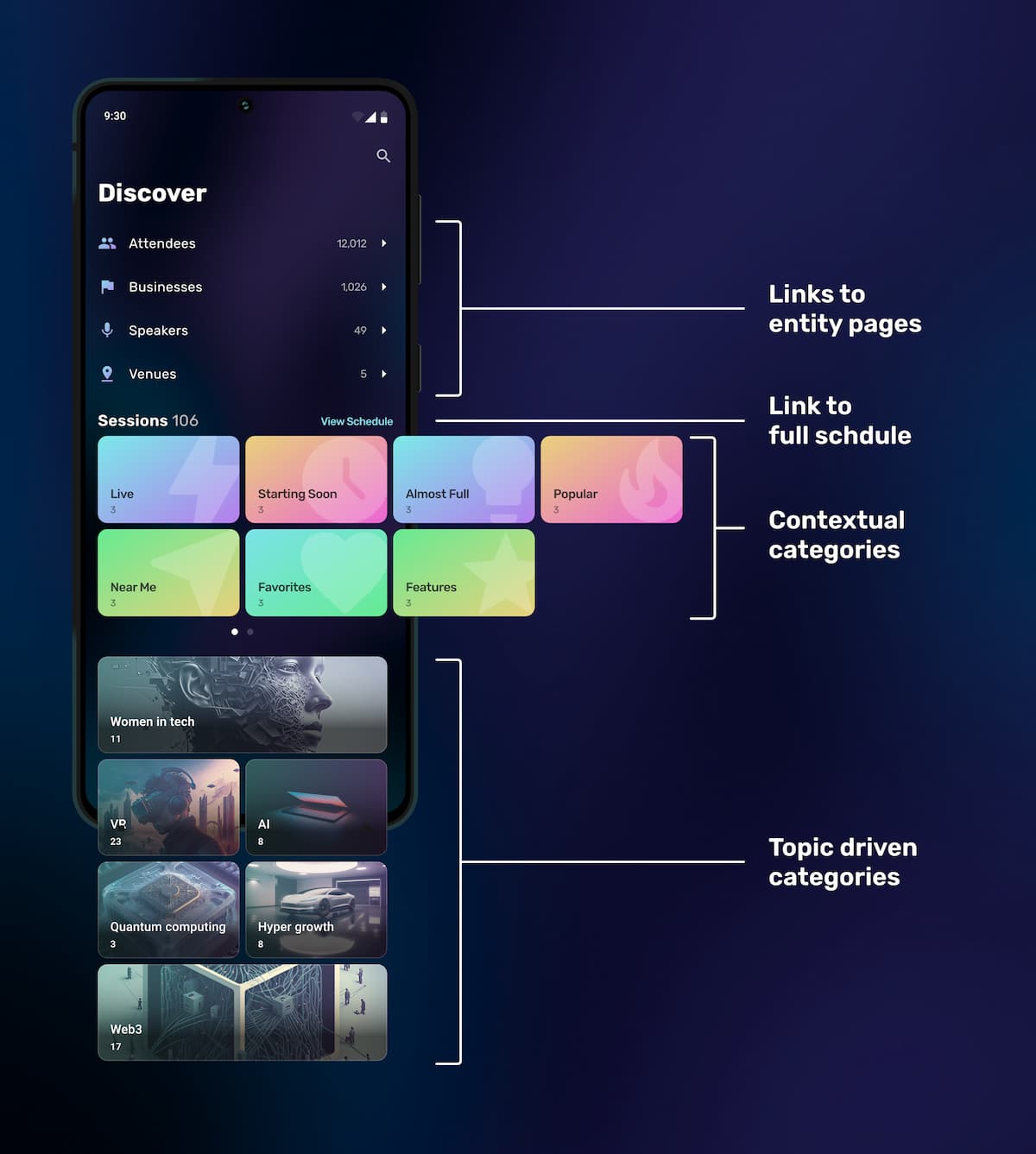 Organizers can build topic-driven categories through the use of feature tiles. While this does provide some direction, it fails to provide contextual relevancy, such as an attendee's favourited content, current location, or overall popularity.