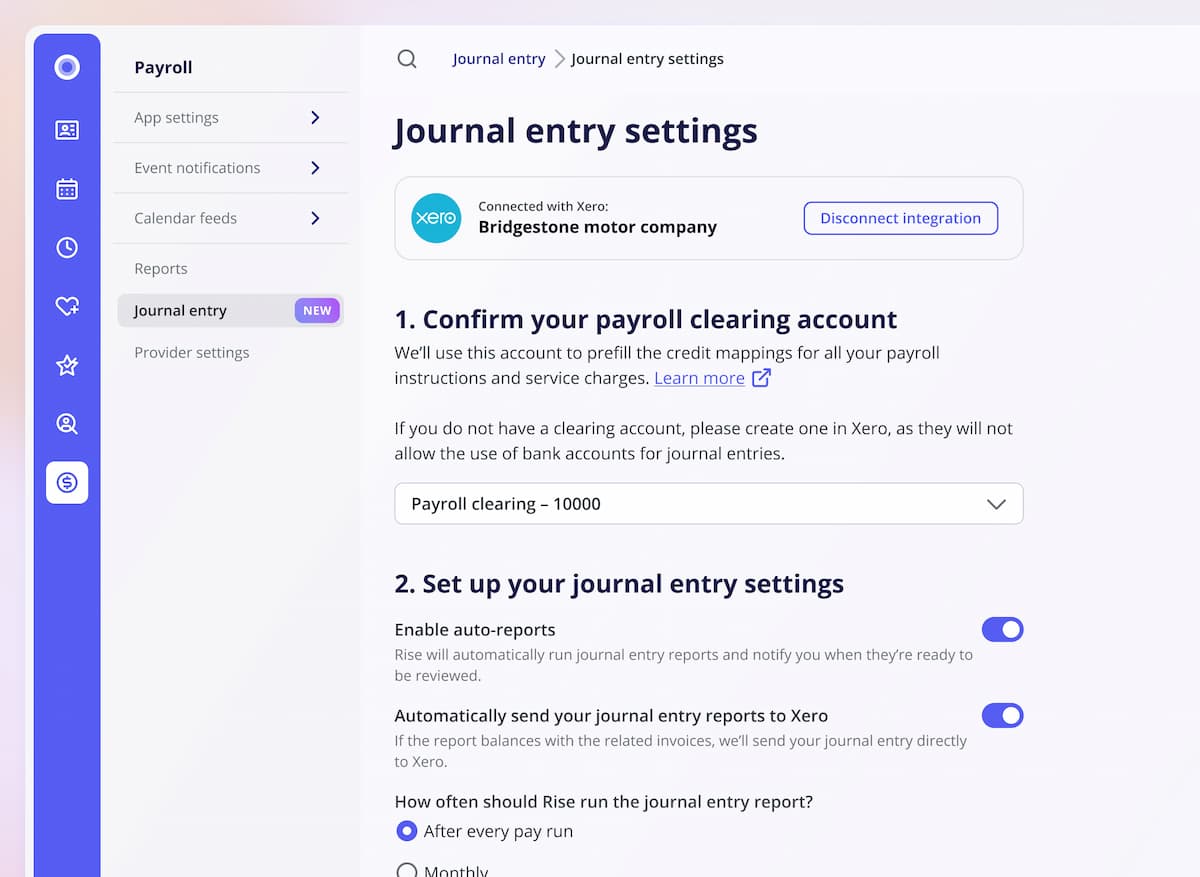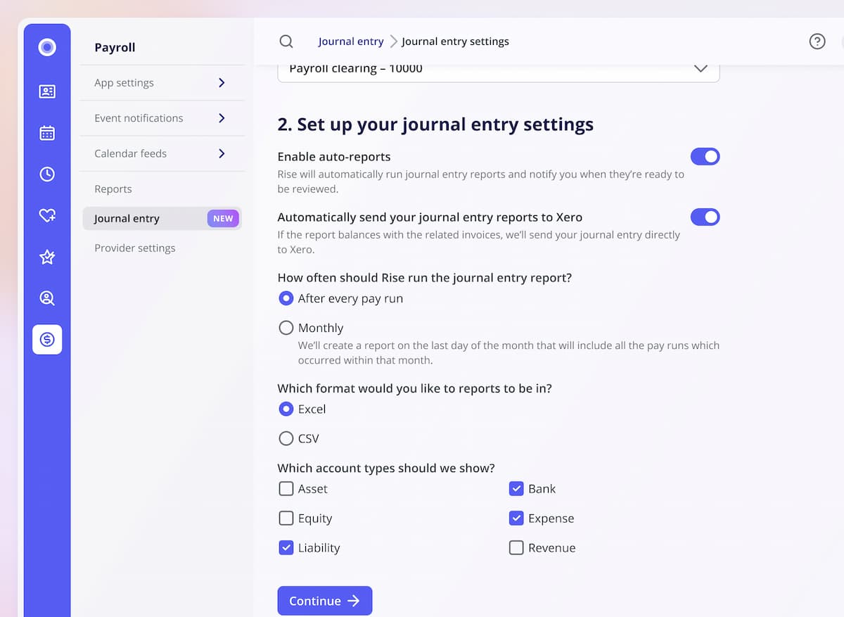 During onboarding, customers are given the power to choose their own adventure. They can enable Rise to create and send journal entries to their general ledger, choose the frequency of which to do so, and dictate the format in which to download their reports.