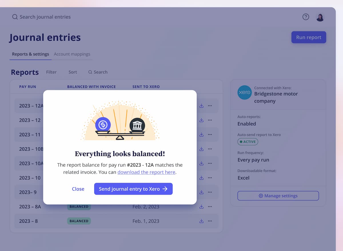 When running a report manually, we’ll display confirmation feedback that the report is balanced and ready to be sent to their general ledger.