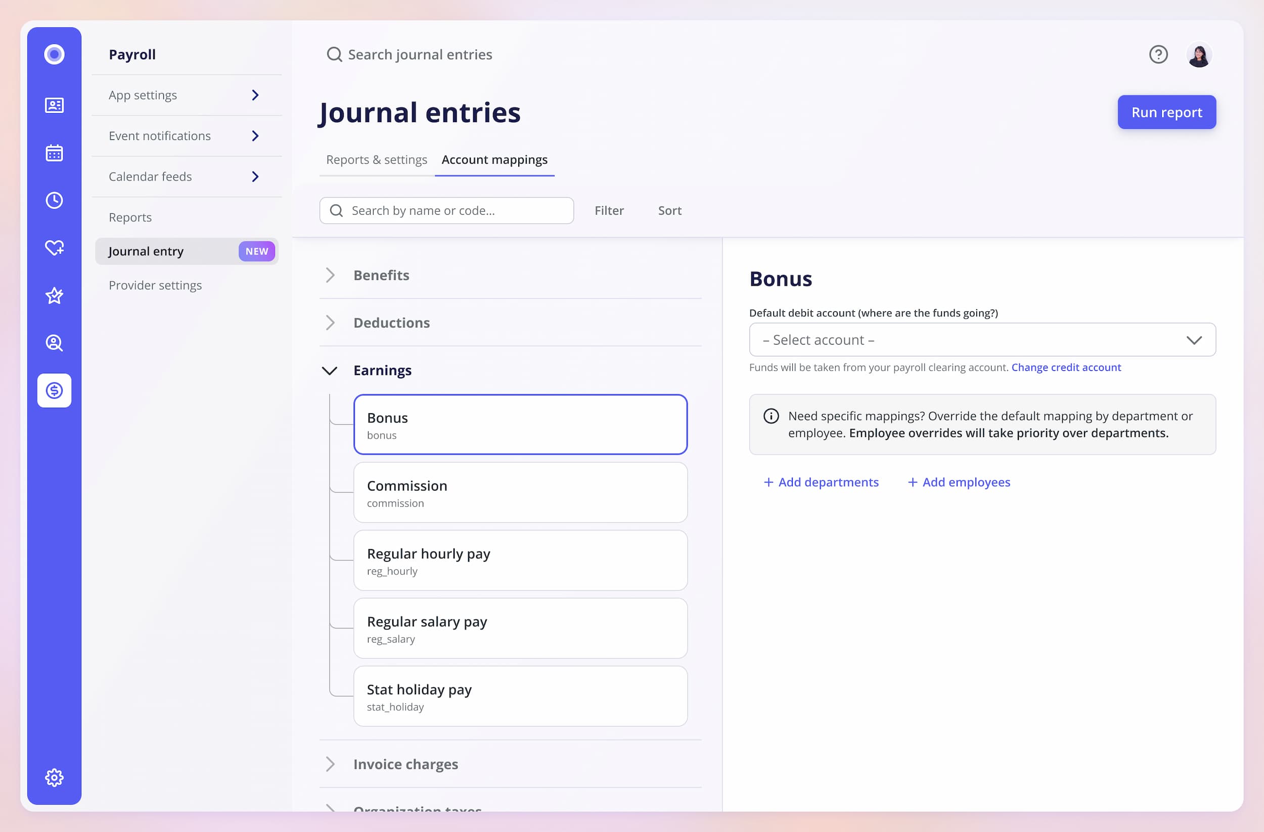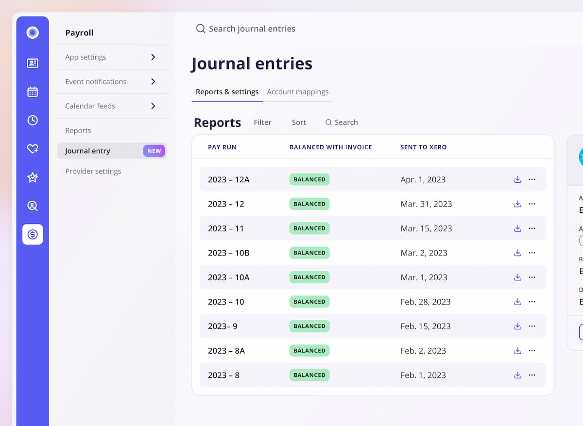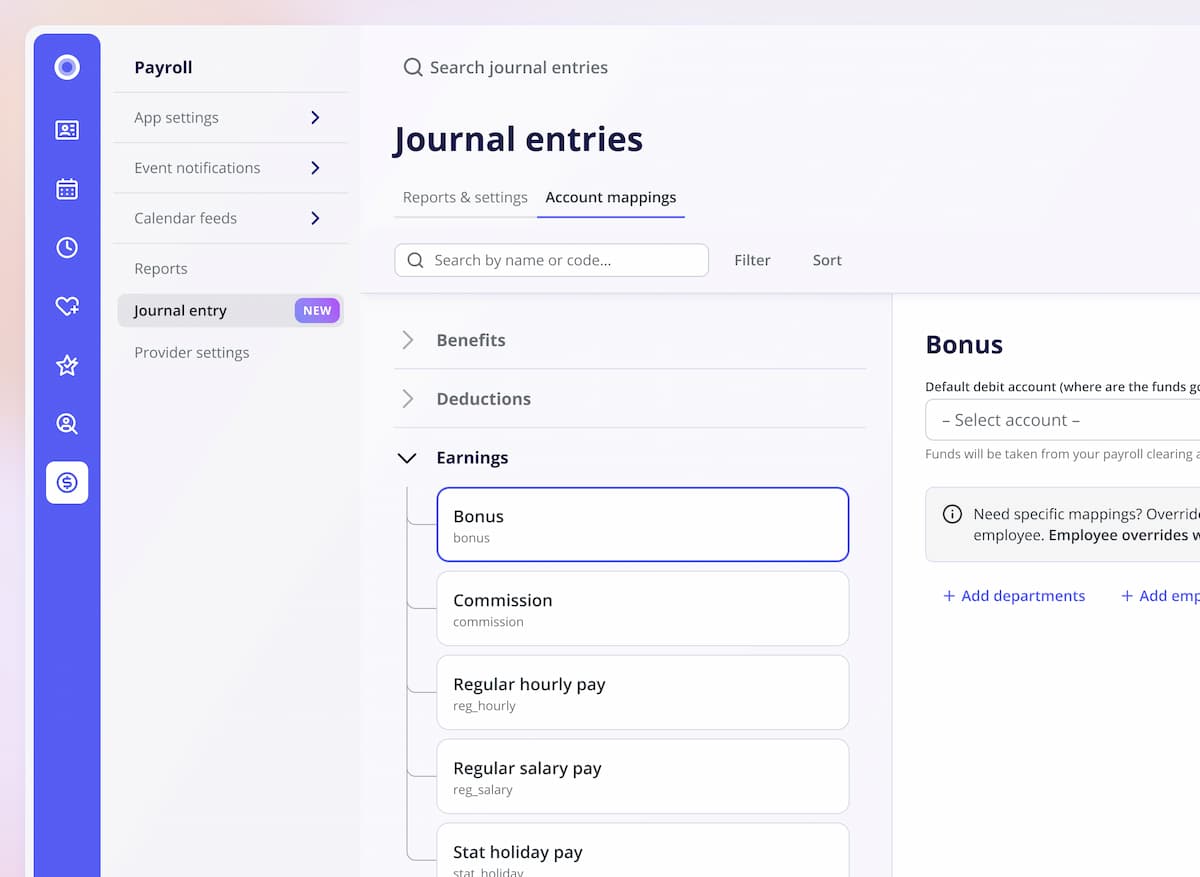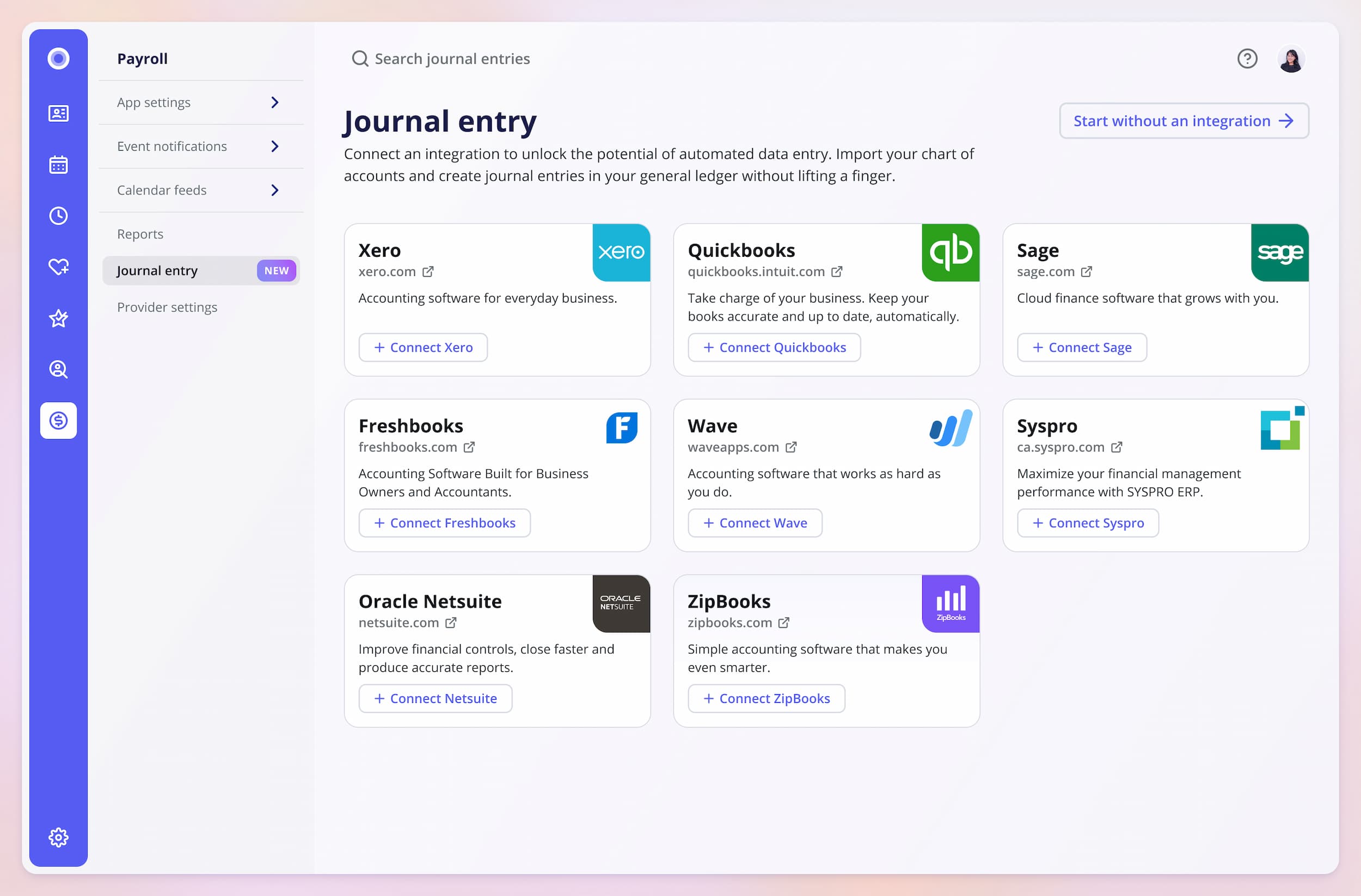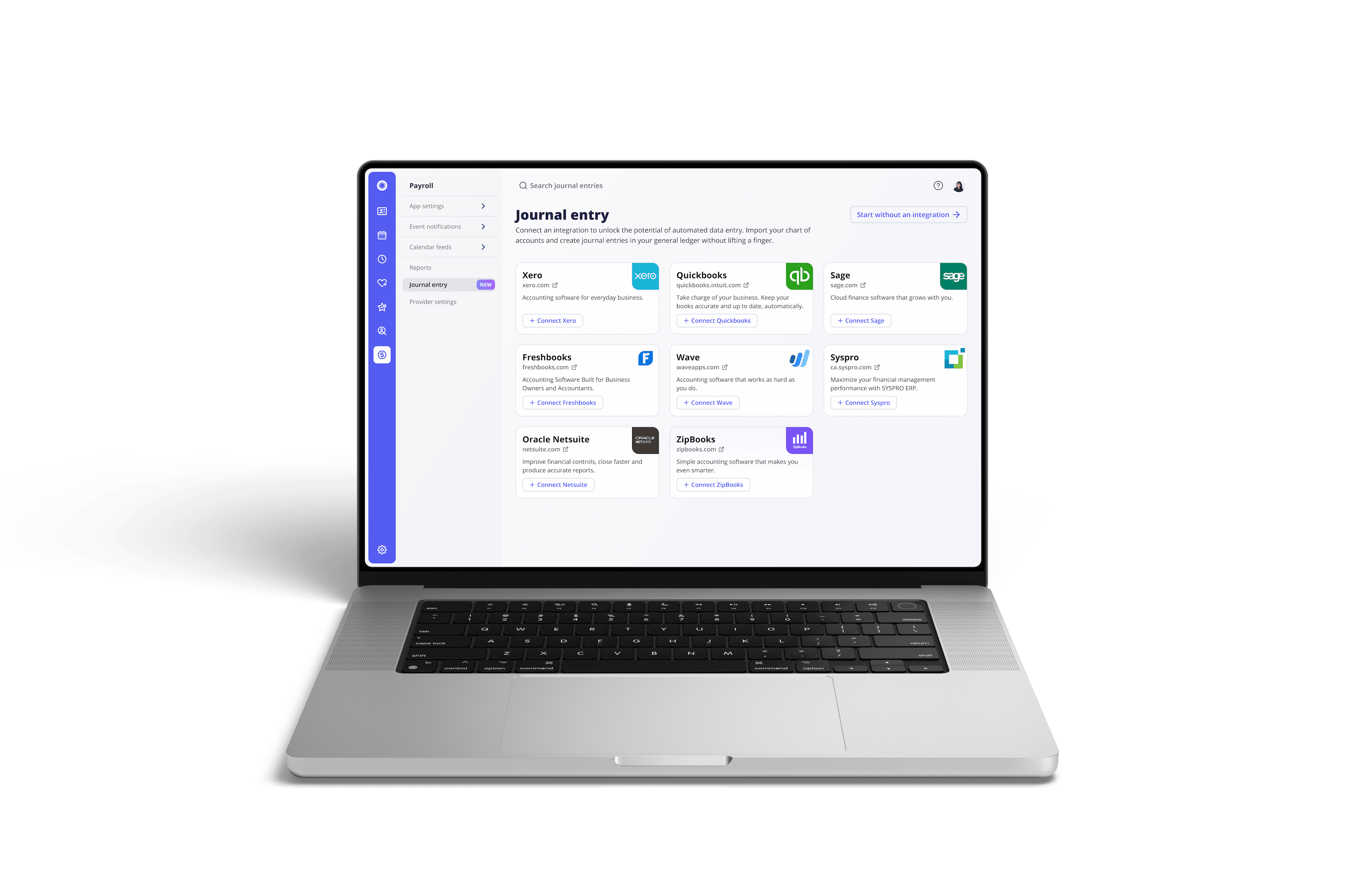 To make a completely automated system, we knew we would have to partner with the top Canadian accounting products. Through integrations, we were able to automatically import and maintain an updated list of our customers' chart of accounts. More importantly, it enabled us to send journal entry data directly to our customers' general ledgers, saving them time and energy every pay run.