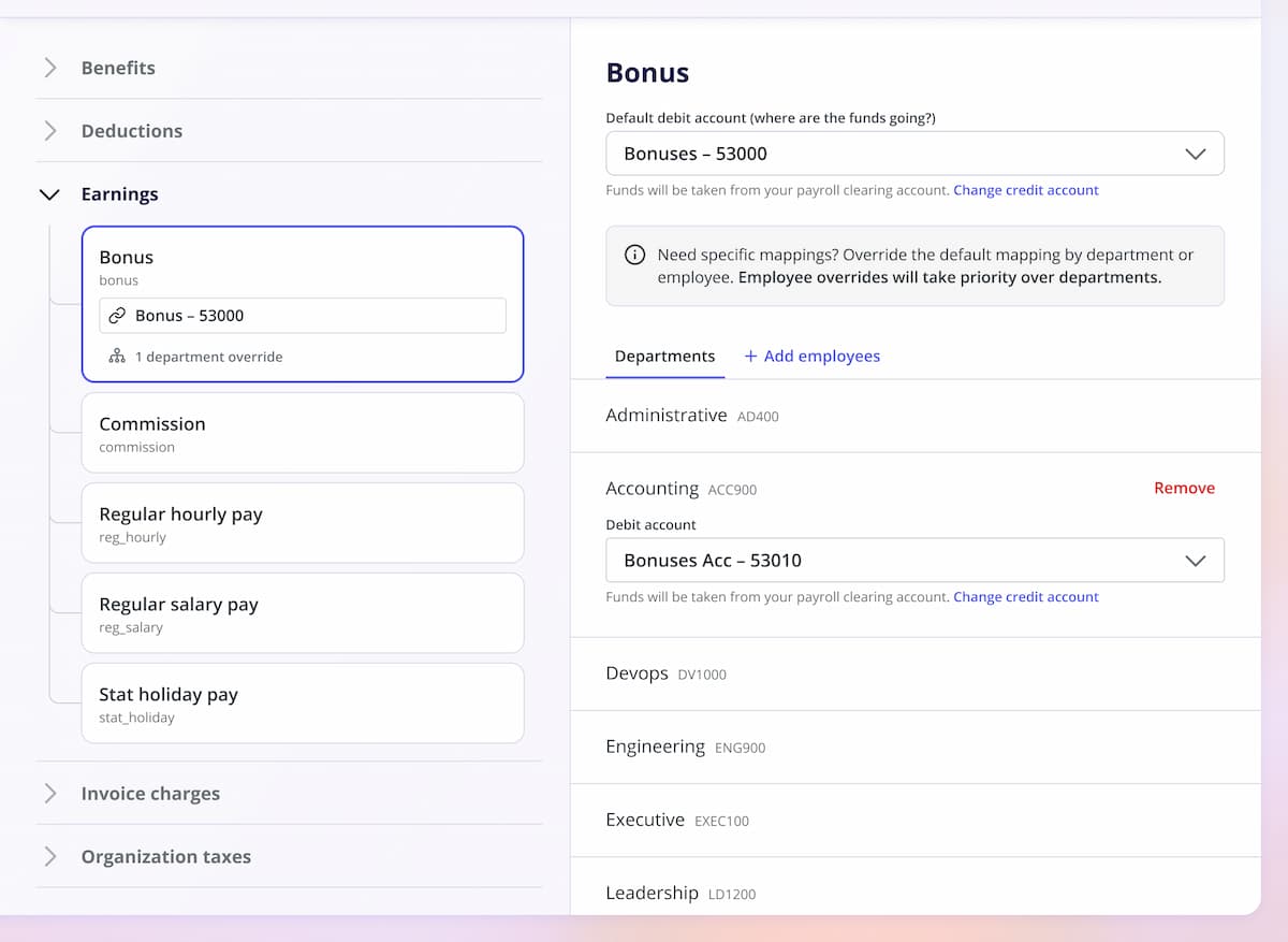 For bookkeepers to track payroll, they need to map each payroll line item to an account from their system (ie. an employee’s commissions might be mapped to a “Salaries and wages” account).