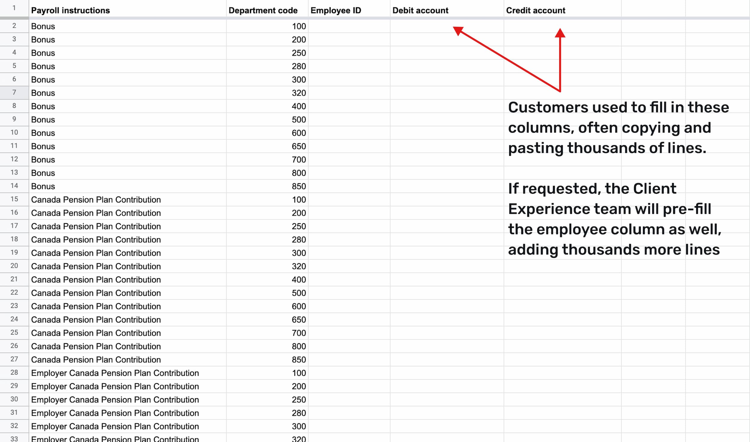 Our onboarding process relied on our Client Experience team setting up spreadsheets with payroll and department data, sometimes containing thousands of lines, for customers to then fill in with accounts. Errors often led to multiple iterations, sometimes taking months before customers could run their first report.